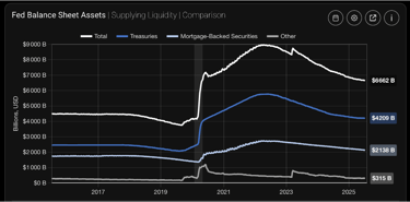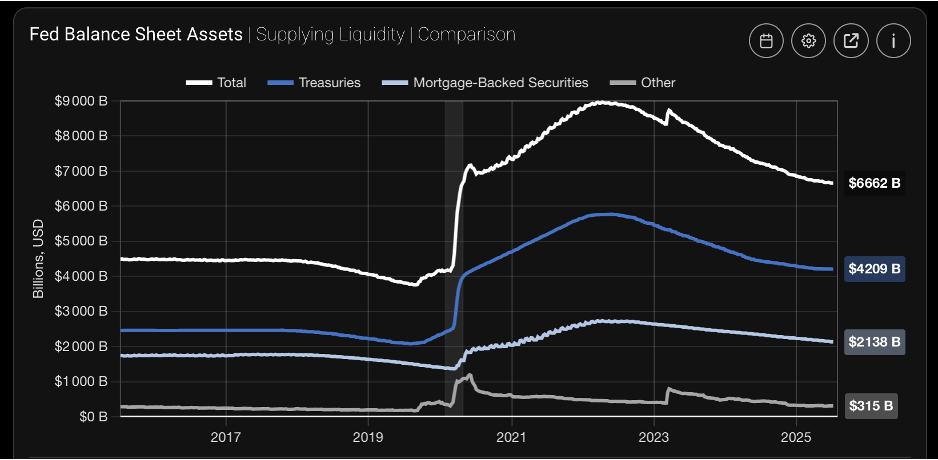 While the Fed’s balance sheet has declined from its 2022 peak — now at $6.66 trillion — this contraction alone masks the underlying liquidity injections occurring via Treasury spending, BTFP usage, and drawdowns from the RRP and TGA.
