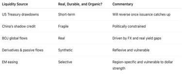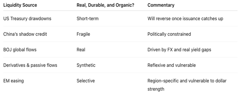 Liquidity in 2025 is not coming from rate cuts or QE. It is coming from the interplay of fiscal injections, cross-border flows, synthetic leverage, and market reflexivity. The result is a buoyant market with fragile underpinnings.